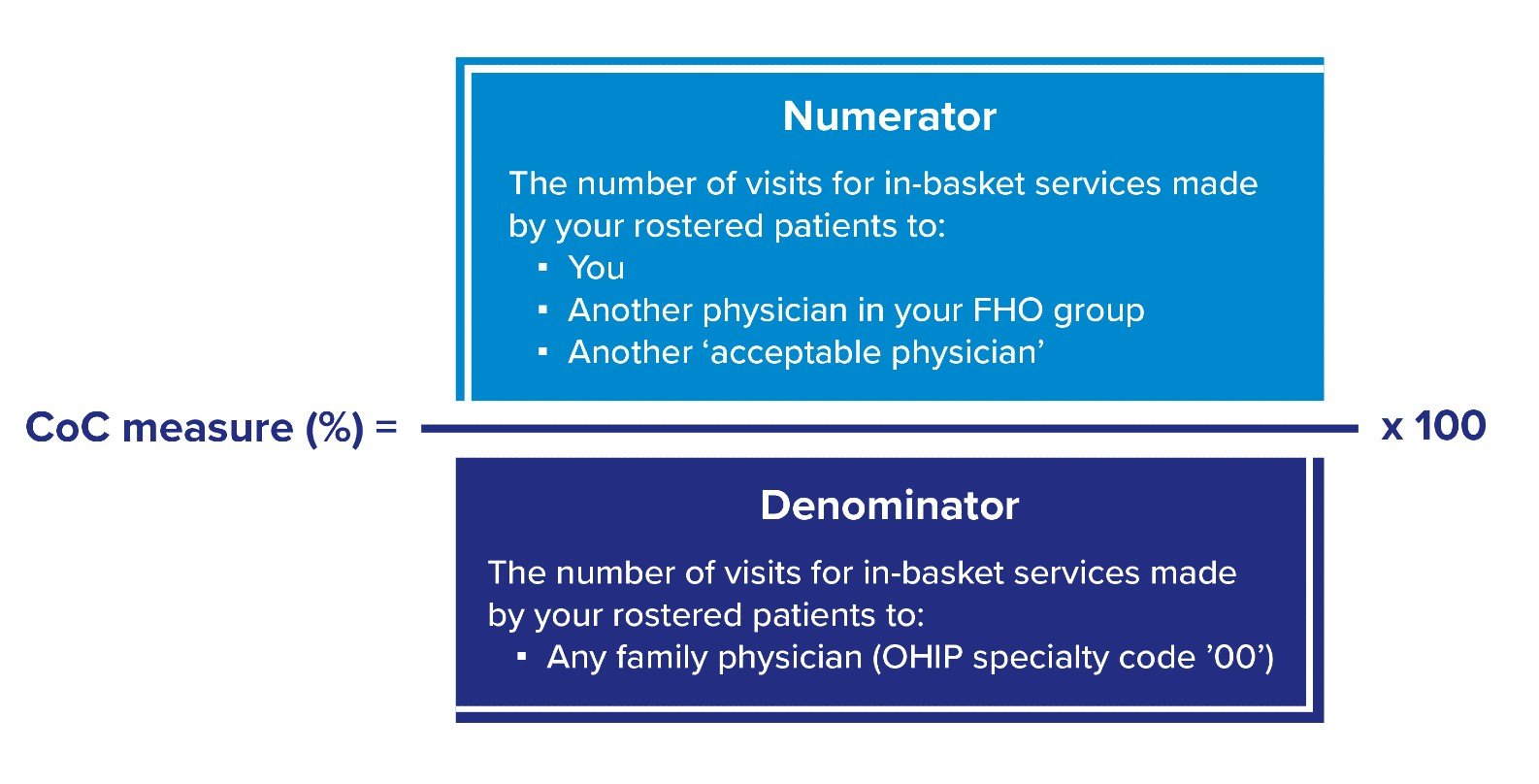 The new continuity of care measure will calculate the proportion of in-basket visits that are provided to your rostered patients (including long-term care enrolled patients) by you, a physician in your FHO or another physician that the ministry deems an “Acceptable Provider” (for example, a focused practice physician) versus in-basket visits provided to your rostered patients by any family physician (OHIP specialty code ‘00’). Please note that your roster of LTC-enrolled patients will be measured using the LTC basket of fee codes.