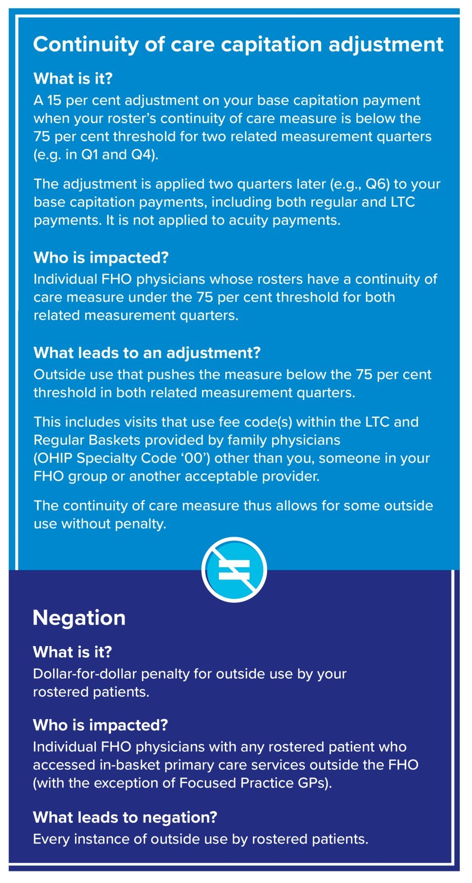 Note that negation and the access bonus will remain in Family Health Networks and Blended Salary Models. The continuity of care measure does not apply to these models.