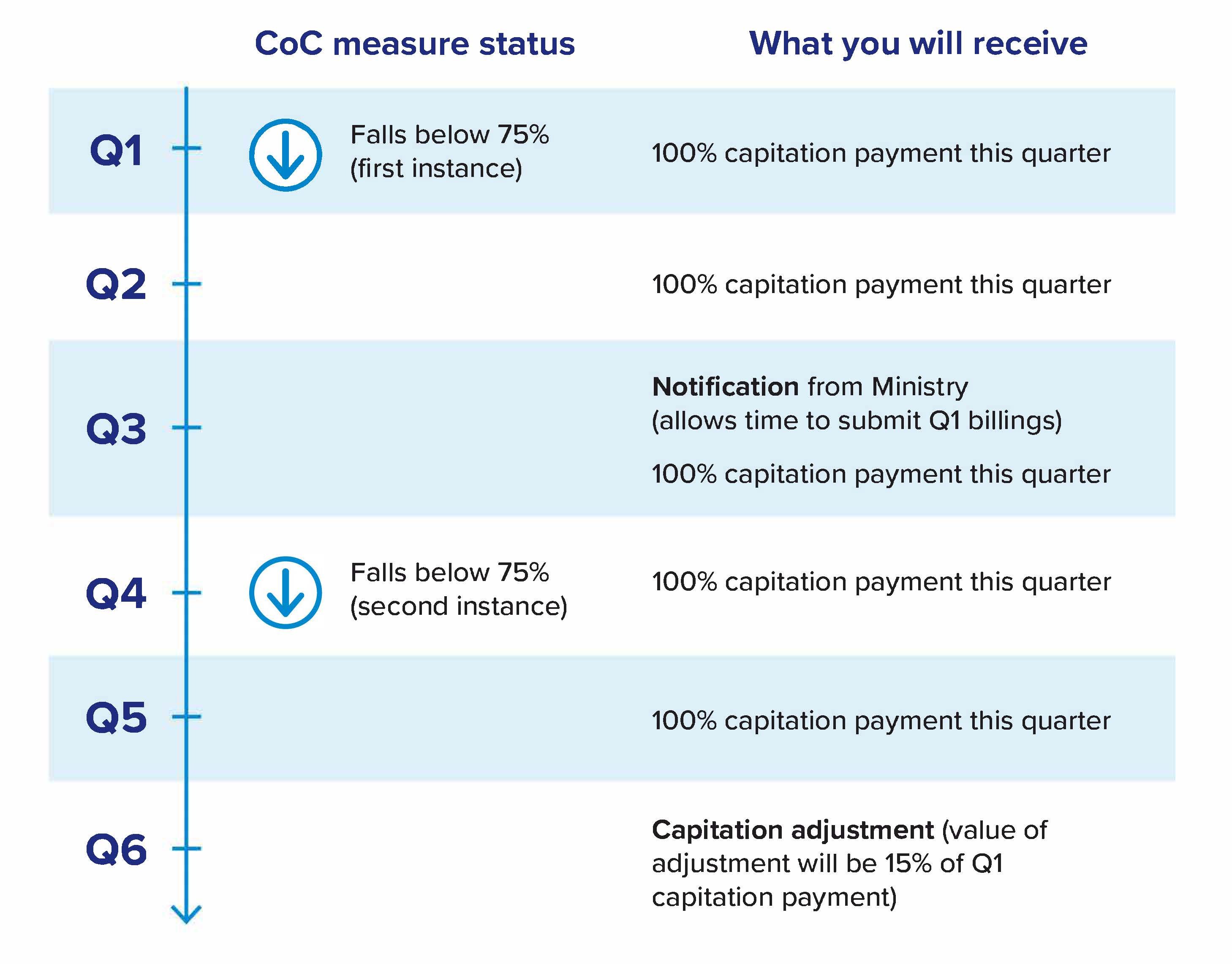 If your roster does not meet the 75 per cent continuity of care threshold for the quarter following notification (Q4) – a second quarter of your roster being below 75 per cent – 15 per cent of what was paid to you in Q1 will be subtracted from your Q6 capitation payment. This adjustment will be applied to your total capitation payments (including both regular and LTC capitation payments).